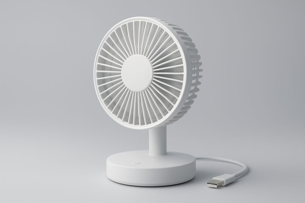 Kompakter Desktop-USB-Ventilator mit gleichmäßigem Luftstrom für Büros.